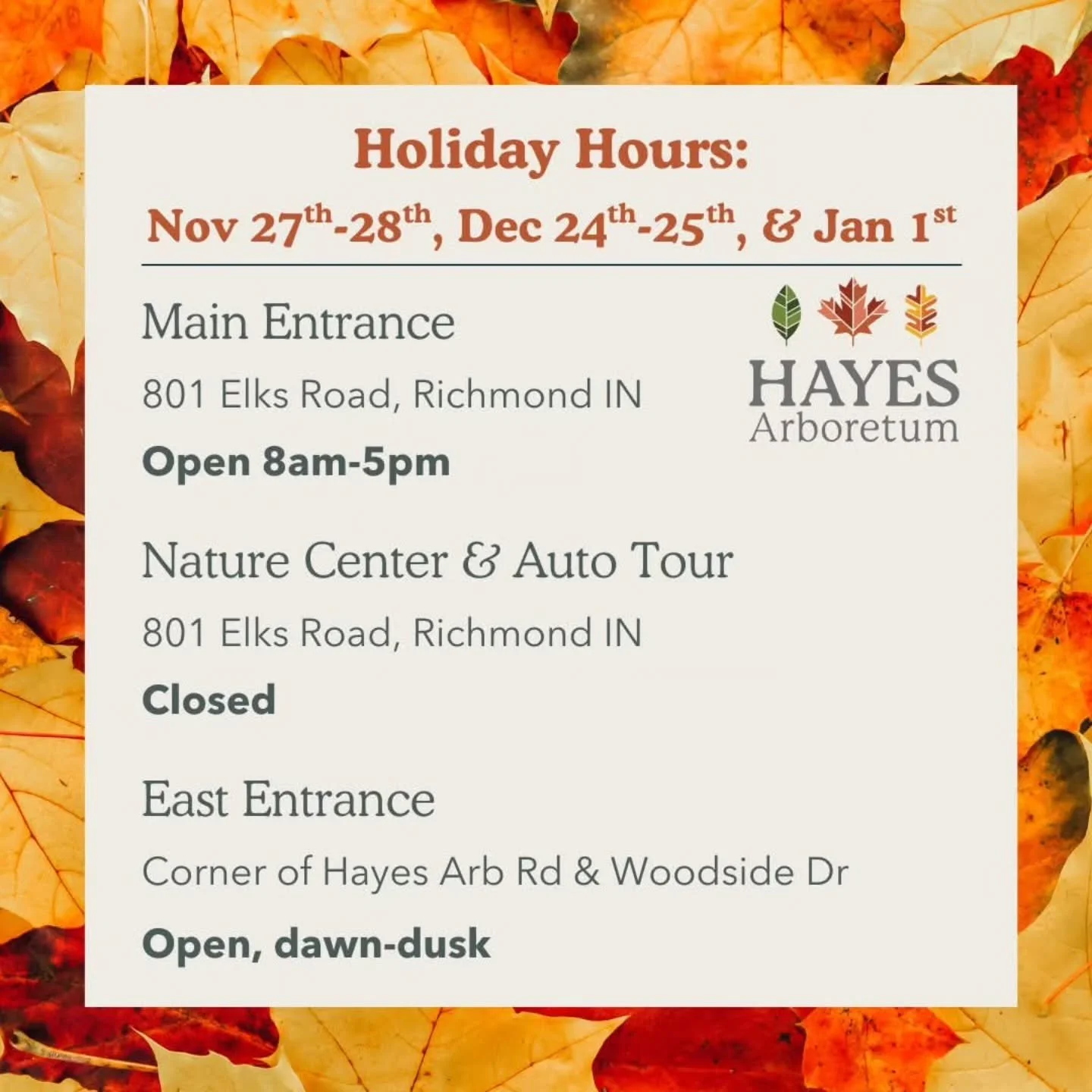Connecting People to Nature for Over 60 Years Discover how the vision of Stanley W Hayes turned into a legacy of environmental stewardship. Mission & History New Certification for Hayes Arb Hayes Arboretum was awarded a Level II Accreditation through ArbNet. News from Hayes Tree Observations Used in Scientific Article Data collected at Hayes Arboretum is making a difference. News from Hayes Powered by the Sun Newly installed Solar Panels power the Nature Center. News from Hayes Quick Links Become a Member Support our mission by becoming a member today. Trail Map Explore 330 acres along 16 miles of trail. Upcoming Events Join us during our next event. Follow us on socials View fullsize View fullsize View fullsize View fullsize Follow on Facebook Follow on Instagram Certifications & Partners